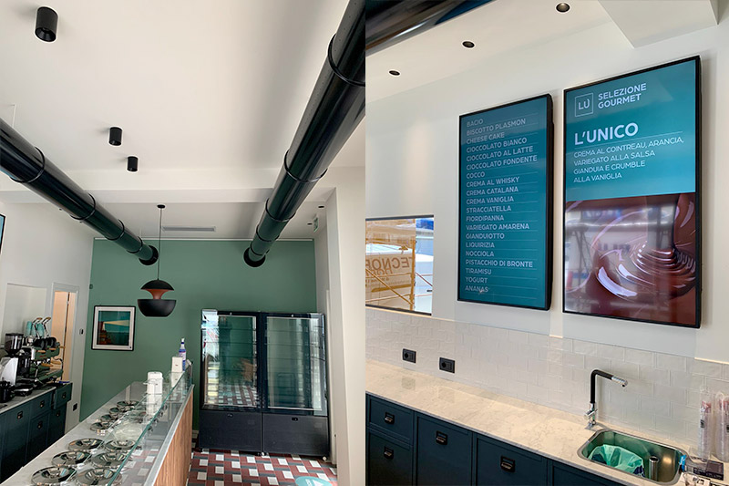 Per rendere visibili il menù del giorno con i gusti di gelato e le comunicazioni al pubblico, abbiamo infine dotato l’attività di un sistema di digital signage, composto da due monitor da 55 pollici.