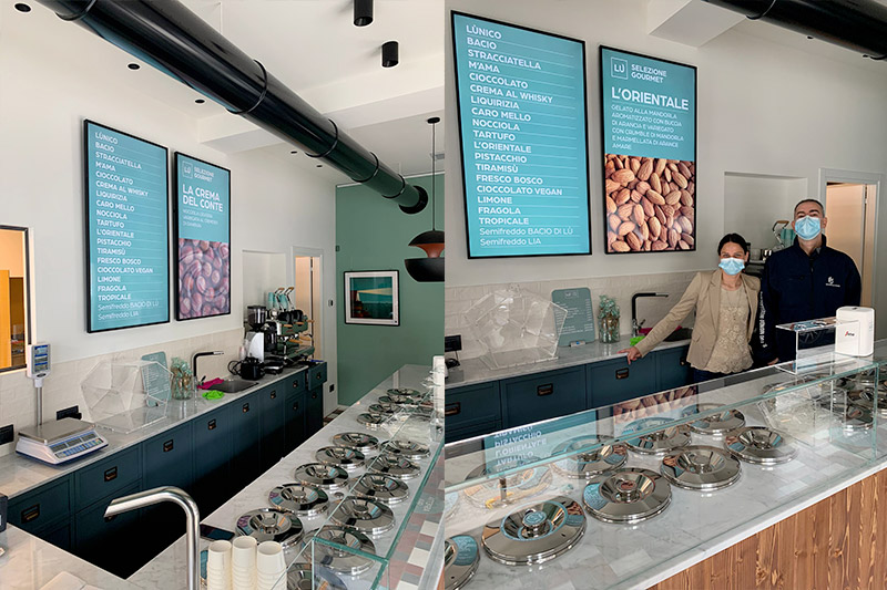 Per rendere visibili il menù del giorno con i gusti di gelato e le comunicazioni al pubblico, abbiamo infine dotato l’attività di un sistema di digital signage, composto da due monitor da 55 pollici.