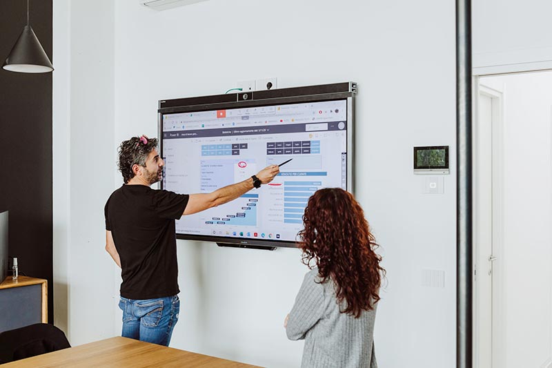 Abbiamo studiato un soluzione semplice ma di grande impatto visivo che ben si adattasse ad uno spazio ridotto. Abbiamo quindi installato una lavagna multimediale che consente al team dell’azienda di fare videoconferenze, presentazioni multimediali da PC esterno o integrato e da touch panel. Tutto in un unico dispositivo.